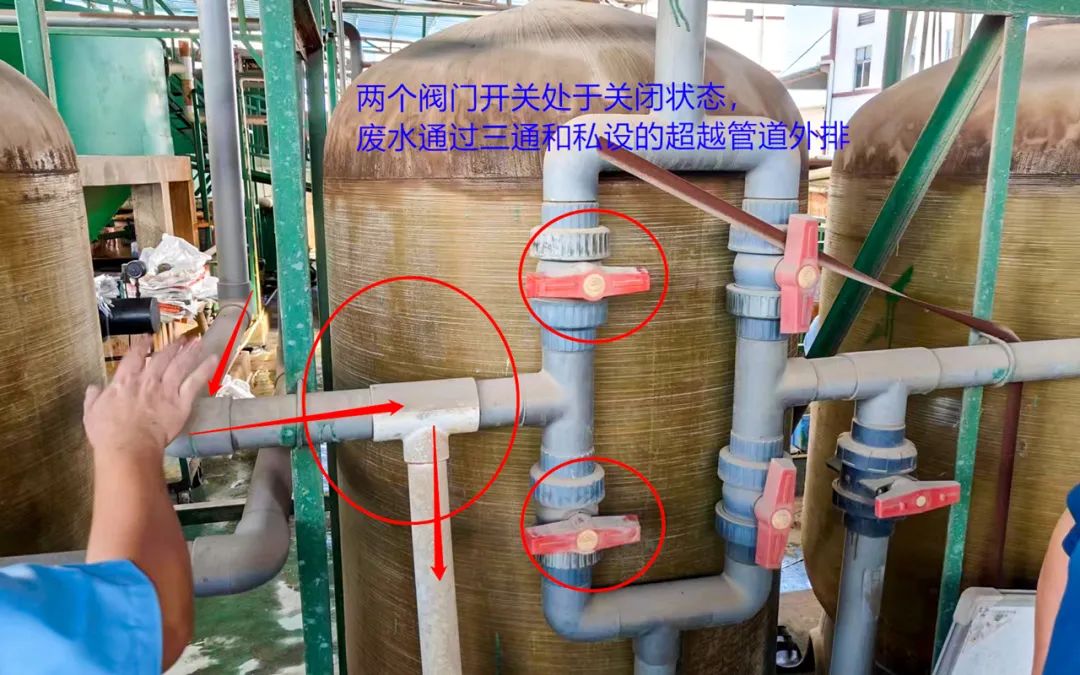 執法人員立即對該企業廢水處理設施的工藝處理情況和廢水管道的走向逐一核查,并與該企業的環評審批和驗收資料作對比。根據環評及驗收文件資料,該企業磨板廢水處理工藝為:磨板廢水→調節池→反應池→沉淀池→回調池→中間水池→砂過濾器→炭過濾器→回用于磨板工序。經檢查,執法人員發現該企業擅自在磨板廢水由中間水池至砂濾、炭濾器的管道上私設三通和2個閥門開關,通過控制三通和閥門開關使磨板廢水在不經過砂過濾器、炭過濾器等后續處理的情況下外排。
