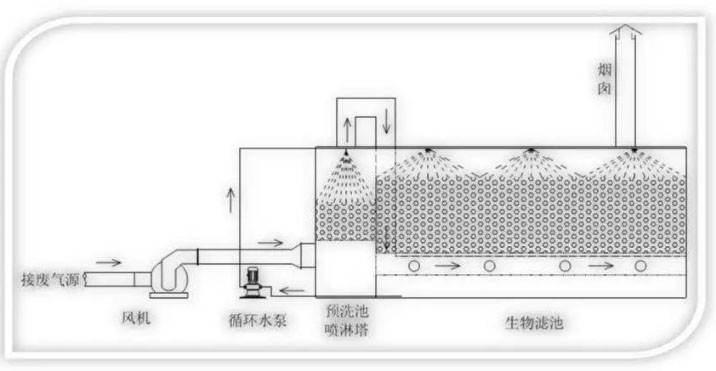生物濾池是填料床濾池。要處理的氣體首先進行預濕,然后在敞開式濾池中,氣體由下向上通過裝滿有機填料濾料床進行處理。在密閉式的濾池中,氣體可經吹送或抽吸通過填料床。當臭氣通過濾池填料時同時發生二個過程:吸著作用(吸和吸收)和生物轉化。臭氣被吸收入填料床的表面和生物膜表面,附著在填料表面的微生物(主要是細菌、真菌等)氧化吸附/吸收的氣體。要保持微生物的活性的關鍵因素是填料床內的濕度和溫度。生物濾池的缺點是占地較大。其優點是較經濟,來自天然的富含有機成分的多孔滲水填料構造簡單,操作方便,無需液體循環系統。